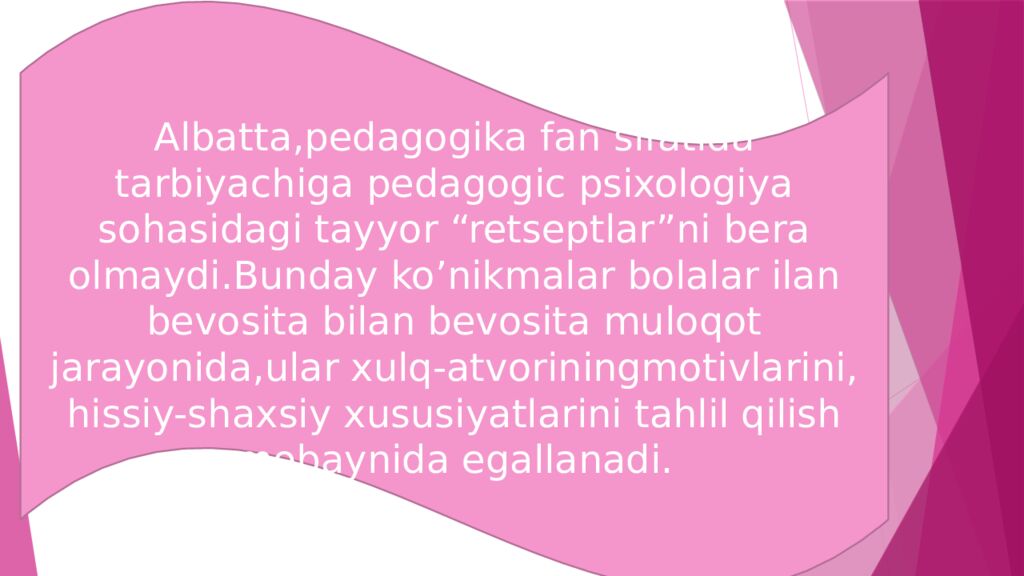 Albatta,pedagogika fan sifatida tarbiyachiga pedagogic psixologiya sohasidagi tayyor “ retseptlar”ni bera olmaydi.Bunday ko’nikmalar bolalar ilan bevosita bilan bevosita muloqot jarayonida,ular xulq-atvoriningmotivlarini, hissiy-shaxsiy xususiyatlarini tahlil qilish mobaynida egallanadi.
