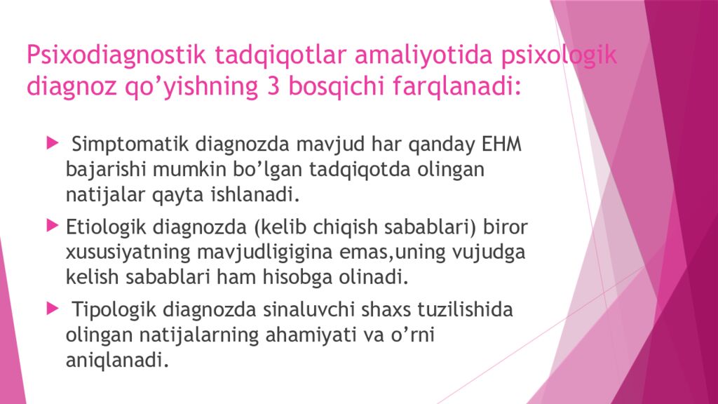 Слайд 8: Psixodiagnostik tadqiqotlar amaliyotida psixologik diagnoz qo’yishning 3 bosqichi farqlanadi :