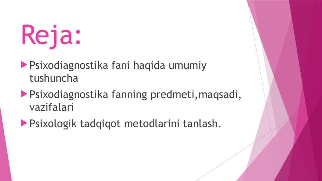 Psixodiagnostika fani haqida umumiy tushuncha Psixodiagnostika f anning predmeti,maqsadi, vazifalari Psixologik tadqiqot metodlarini tanlash.