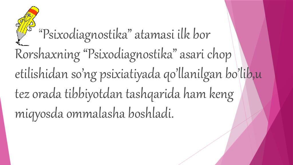 “Psixodiagnostika” atamasi ilk bor Rorshaxning “Psixodiagnostika” asari chop etilishidan so’ng psixiatiyada qo’llanilgan bo’lib,u tez orada tibbiyotdan tashqarida ham keng miqyosda ommalasha boshladi.
