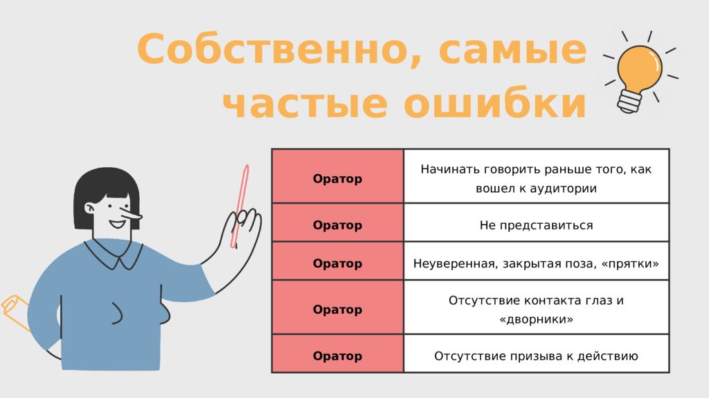 Собственно, самые частые ошибки Оратор Начинать говорить раньше того, как вошел к аудитории Оратор Не представиться Оратор Неуверенная, закрытая поза, «прятки» Оратор Отсутствие контакта глаз и «дворники» Оратор Отсутствие призыва к действию