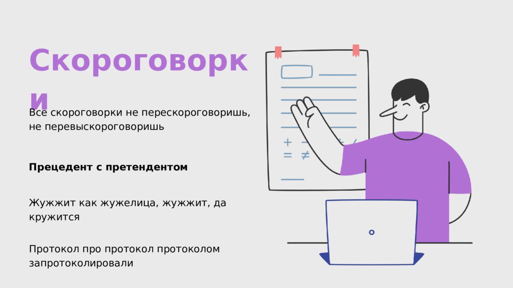 Скороговорки Все скороговорки не перескороговоришь, не перевыскороговоришь Прецедент с претендентом Жужжит как жужелица, жужжит, да кружится Протокол про протокол протоколом запротоколировали