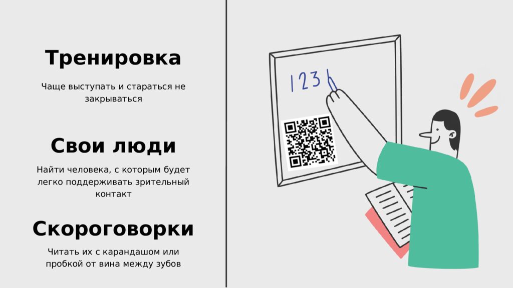 Чаще выступать и стараться не закрываться Тренировка Найти человека, с которым будет легко поддерживать зрительный контакт Свои люди Читать их с карандашом или пробко й от вина между зубов Скороговорки