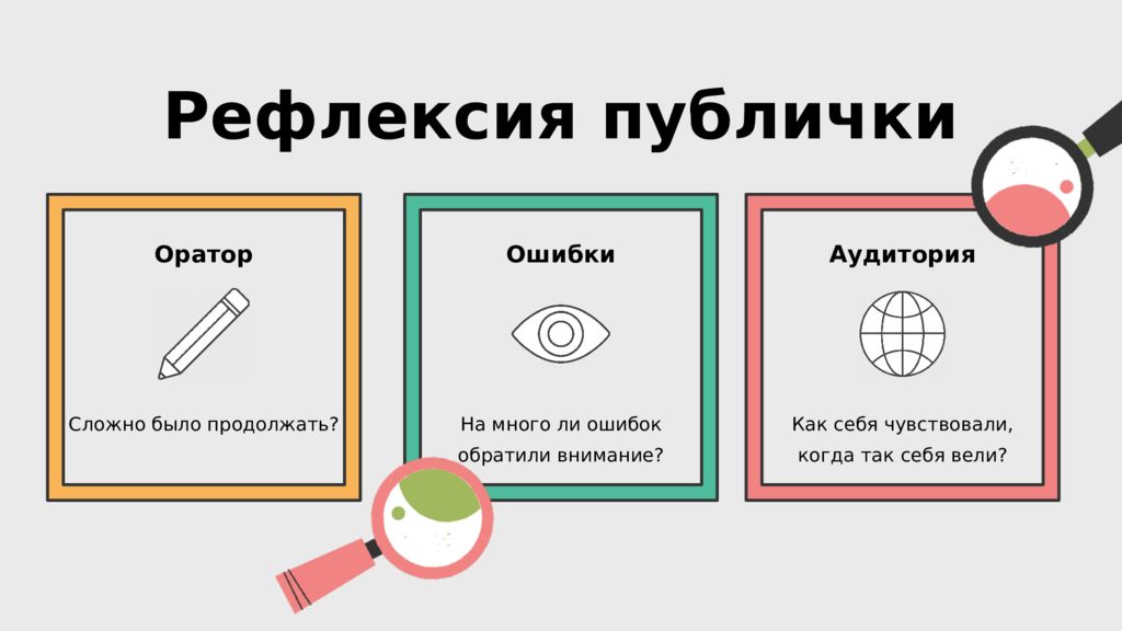 Рефлексия публички Ошибки Аудитория На много ли ошибок обратили внимание? Как себя чувствовали, когда так себя вели ? Оратор Сложно было продолжать ?