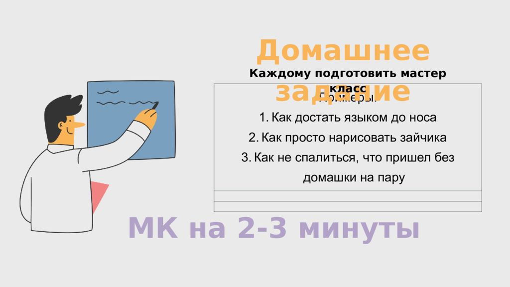 Примеры: Как достать языком до носа Как просто нарисовать зайчика Как не спалиться, что пришел без домашки на пару Домашнее задание Каждому подготовить мастер класс МК на 2-3 минуты