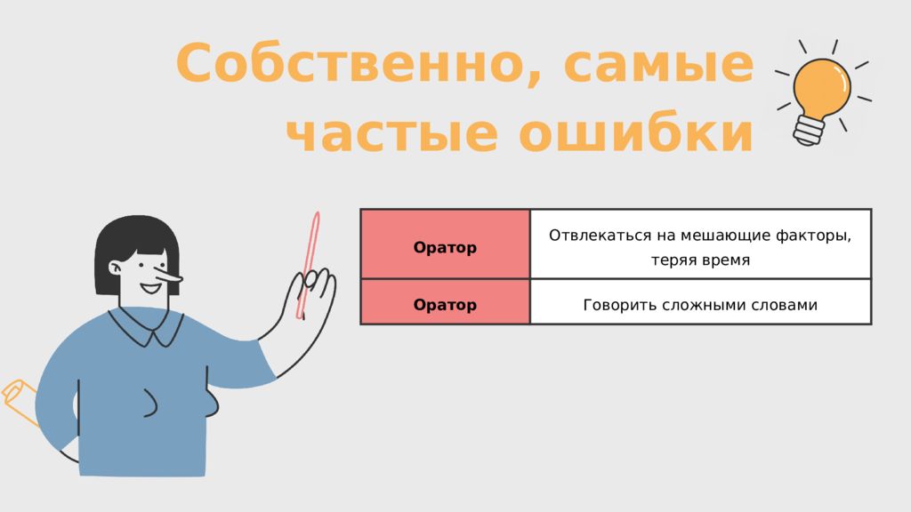 Собственно, самые частые ошибки Оратор Отвлекаться на мешающие факторы, теряя время Оратор Говорить сложными словами
