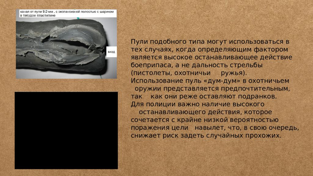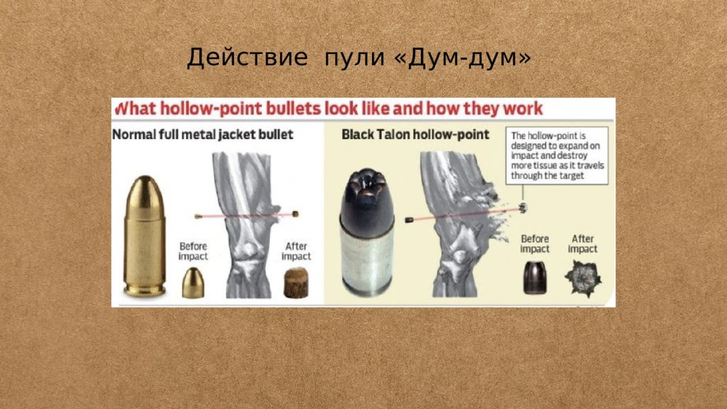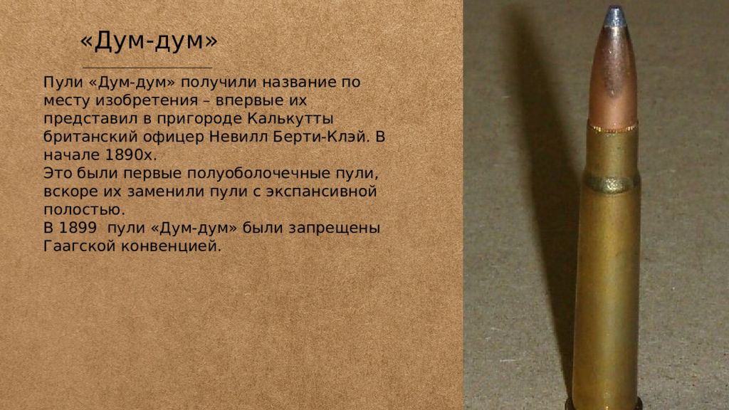 «Дум-дум» Пули «Дум-дум» получили название по месту изобретения – впервые их представил в пригороде Калькутты британский офицер Невилл Берти-Клэй. В начале 1890х. Это были первые полуоболочечные пули, вскоре их заменили пули с экспансивной полостью. В 1899 пули «Дум-дум» были запрещены Гаагской конвенцией.