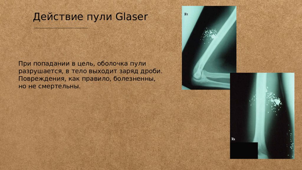 Действие пули Glaser При попадании в цель, оболочка пули разрушается, в тело выходит заряд дроби. Повреждения, как правило, болезненны, но не смертельны.