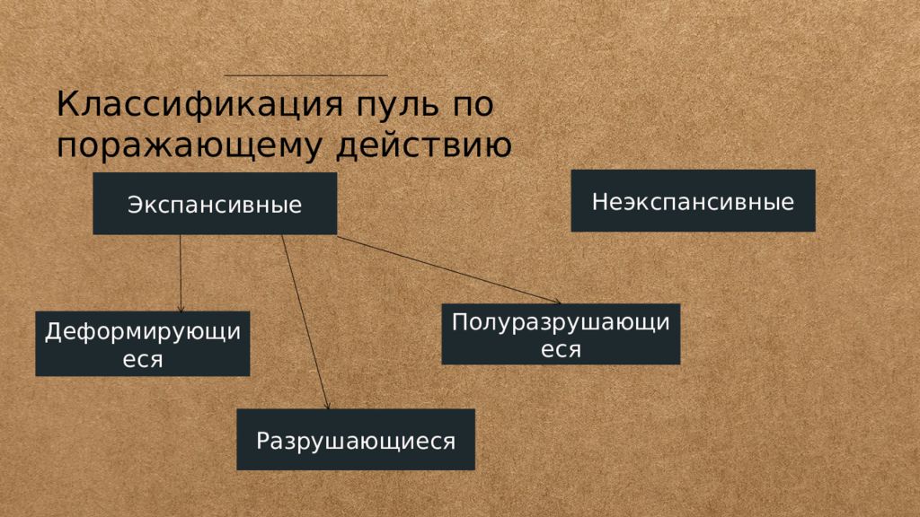 Классификация пуль по поражающему действию Экспансивные Не экспансивные Деформирующиеся Полуразрушающиеся Разрушающиеся