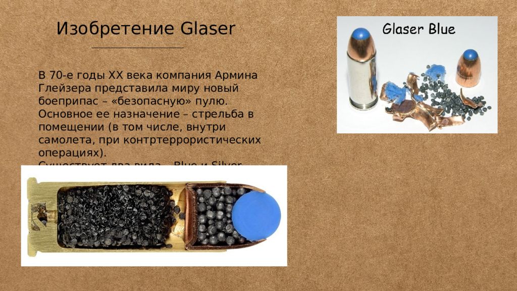 В 70-е годы ХХ века компания Армина Глейзера представила миру новый боеприпас – «безопасную» пулю. Основное ее назначение – стрельба в помещении (в том числе, внутри самолета, при контртеррористических операциях). Существует два вида – Blue и Silver. Изобретение Glaser