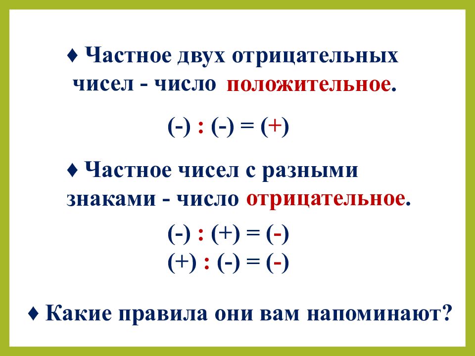 ♦ Частное двух отрицательных чисел - число положительное. (-) : (-) = ( + ) ♦ Частное чисел с разными знаками - число отрицательное. (-) : (+) = ( - ) (+) : (-) = ( - ) ♦ Какие правила они вам напоминают?