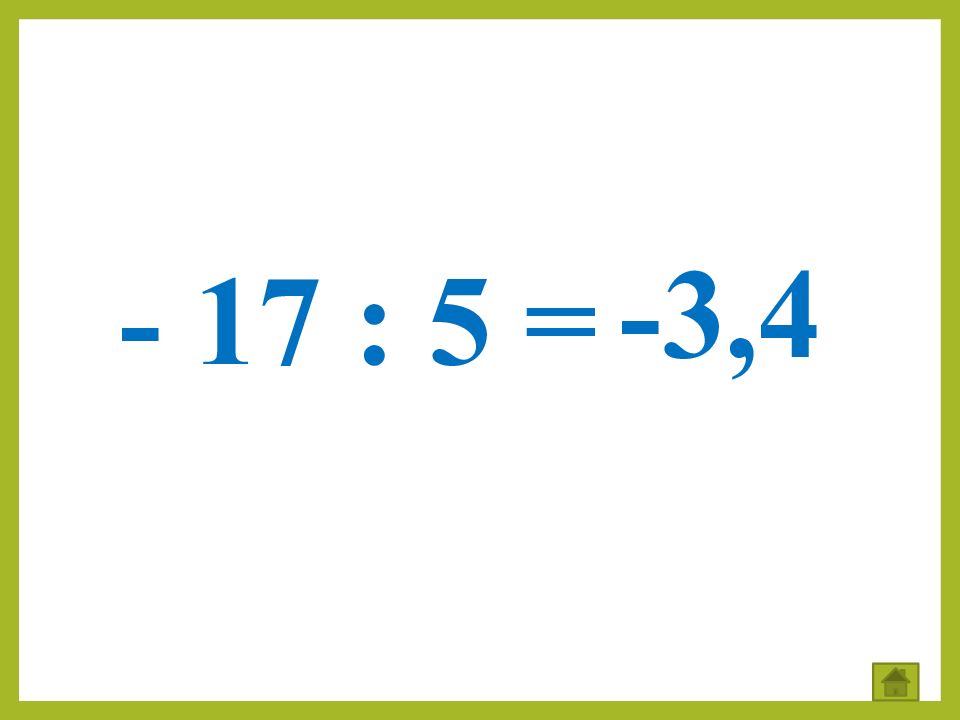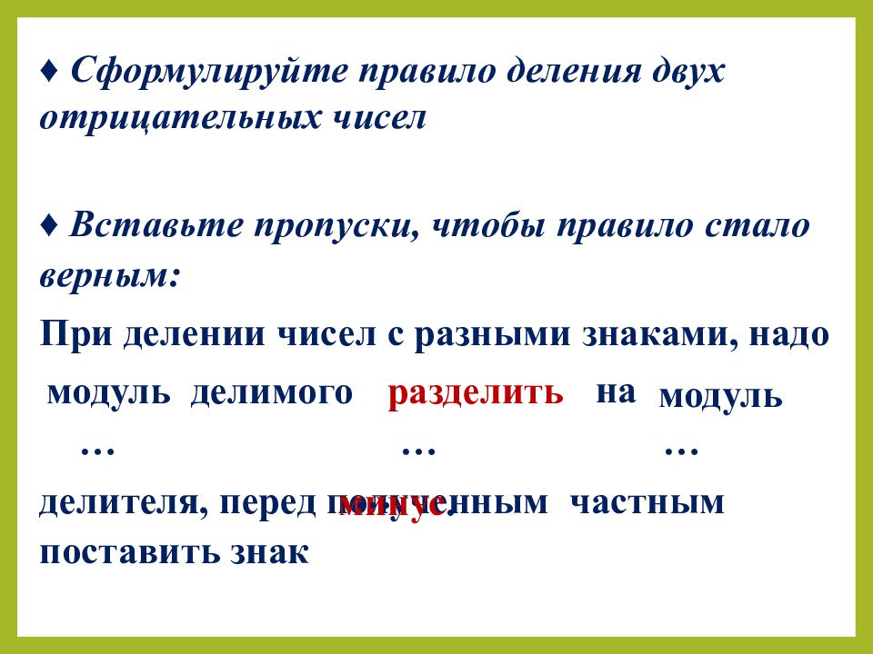 ♦ Сформулируйте правило деления двух отрицательных чисел ♦ Вставьте пропуски, чтобы правило стало верным : При делении чисел с разными знаками, надо … … … делителя, перед полученным частным поставить знак модуль разделить модуль минус. делимого на …