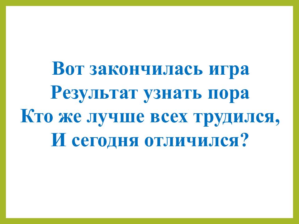 Вот закончилась игра Результат узнать пора Кто же лучше всех трудился, И сегодня отличился?
