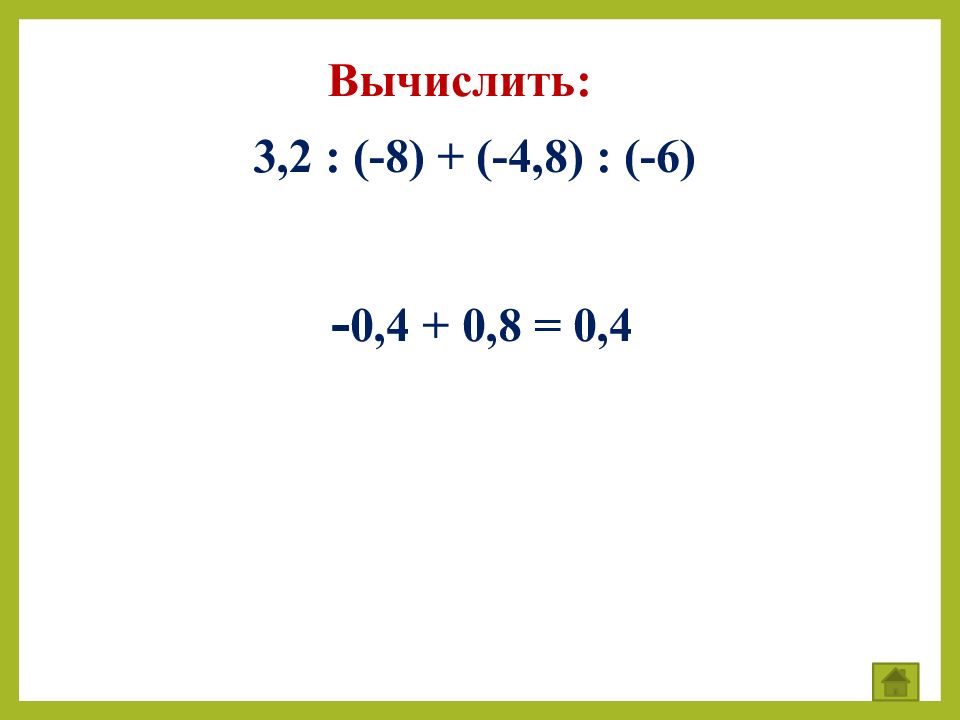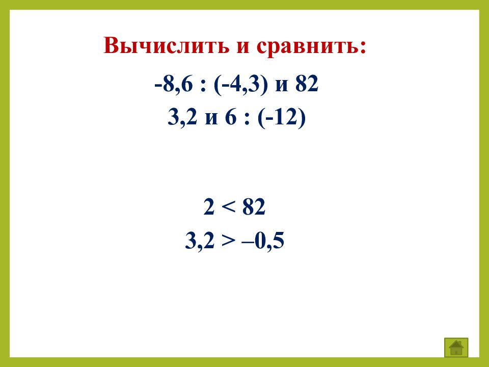 Вычислить и сравнить: -8,6 : (-4,3) и 82 3,2 и 6 : (-12 ) 2 < 82 3,2 > – 0,5