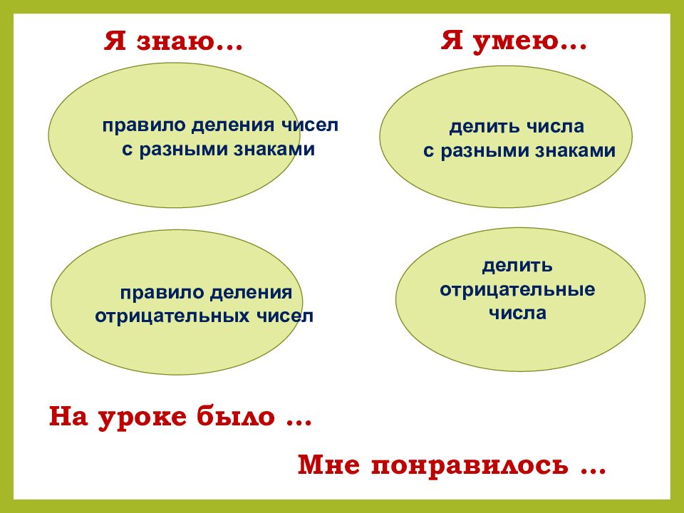 Я знаю... п равило деления чисел с разными знаками делить числа с разными знаками Я умею... п равило деления о трицательных чисел д елить отрицательные числа На уроке было … Мне понравилось …