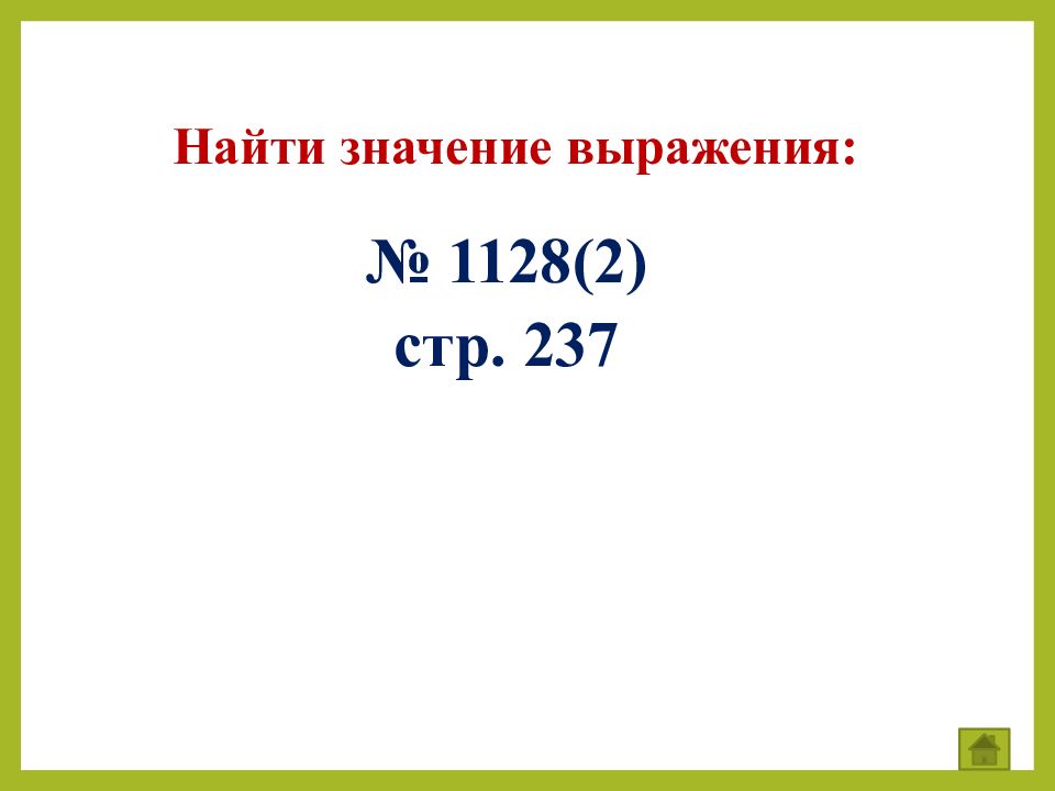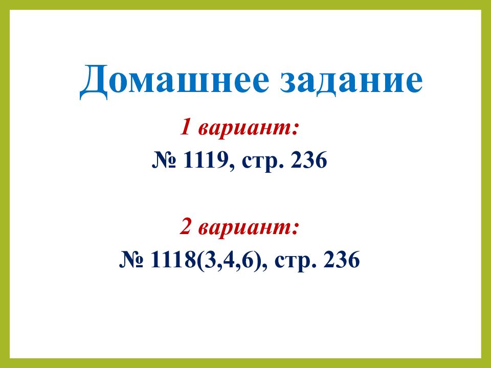 Домашнее задание 1 вариант: № 1119, стр. 236 2 вариант: № 1118(3,4,6), стр. 236