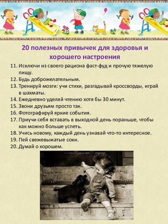 20 полезных привычек для здоровья и хорошего настроения 11. Исключи из своего рациона фаст-фуд и прочую тяжелую пищу. 12. Будь доброжелательным. 13. Тренируй мозги: учи стихи, разгадывай кроссворды, играй в шахматы. 14. Ежедневно уделяй чтению хотя бы 30 минут. 15. Звони друзьям просто так. 16. Фотографируй яркие события. 17. Приучи себя вставать в выходной день пораньше, чтобы как можно больше успеть. 18. Учись новому, каждый день узнавай что-то интересное. 19. Пей свежевыжатые соки. 20. Думай о хорошем.