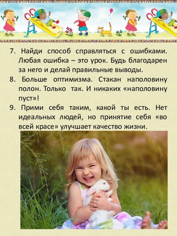 7. Найди способ справляться с ошибками. Любая ошибка – это урок. Будь благодарен за него и делай правильные выводы. 8. Больше оптимизма. Стакан наполовину полон. Только так. И никаких «наполовину пуст»! 9. Прими себя таким, какой ты есть. Нет идеальных людей, но принятие себя «во всей красе» улучшает качество жизни.