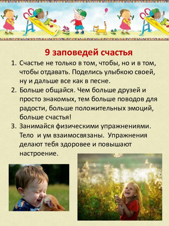 9 заповедей счастья Счастье не только в том, чтобы, но и в том, чтобы отдавать. Поделись улыбкою своей, ну и дальше все как в песне. Больше общайся. Чем больше друзей и просто знакомых, тем больше поводов для радости, больше положительных эмоций, больше счастья! Занимайся физическими упражнениями. Тело и ум взаимосвязаны. Упражнения делают тебя здоровее и повышают настроение.