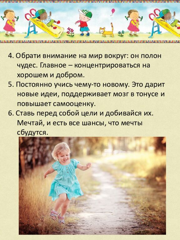 4. Обрати внимание на мир вокруг: он полон чудес. Главное – концентрироваться на хорошем и добром. 5. Постоянно учись чему-то новому. Это дарит новые идеи, поддерживает мозг в тонусе и повышает самооценку. 6. Ставь перед собой цели и добивайся их. Мечтай, и есть все шансы, что мечты сбудутся.