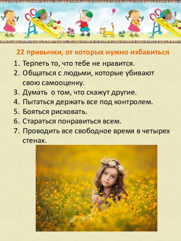 22 привычки, от которых нужно избавиться Терпеть то, что тебе не нравится. Общаться с людьми, которые убивают свою самооценку. Думать о том, что скажут другие. Пытаться держать все под контролем. Бояться рисковать. Стараться понравиться всем. Проводить все свободное время в четырех стенах.