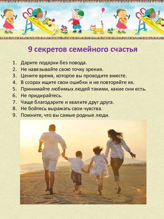 9 секретов семейного счастья Дарите подарки без повода. Не навязывайте свою точку зрения. Цените время, которое вы проводите вместе. В ссорах ищите свои ошибки и не повторяйте их. Принимайте любимых людей такими, какие они есть. Не придирайтесь. Чаще благодарите и хвалите друг друга. Не бойтесь выражать свои чувства. Помните, что вы самые родные люди.