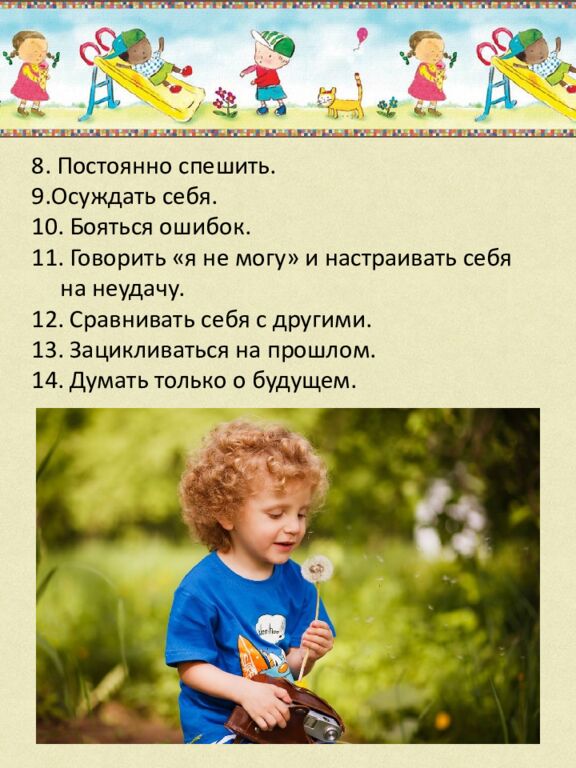 8. Постоянно спешить. 9.Осуждать себя. 10. Бояться ошибок. 11. Говорить «я не могу» и настраивать себя на неудачу. 12. Сравнивать себя с другими. 13. Зацикливаться на прошлом. 14. Думать только о будущем.