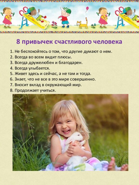 8 привычек счастливого человека 1. Не беспокойтесь о том, что другие думают о нем. 2. Всегда во всем видит плюсы. 3. Всегда дружелюбен и благодарен. 4. Всегда улыбается. 5. Живет здесь и сейчас, а не там и тогда. 6. Знает, что не все в это мире совершенно. 7. Вносит вклад в окружающий мир. 8. Продолжает учиться.