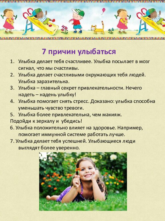 7 причин улыбаться Улыбка делает тебя счастливее. Улыбка посылает в мозг сигнал, что мы счастливы. Улыбка делает счастливыми окружающих тебя людей. Улыбка заразительна. Улыбка – главный секрет привлекательности. Нечего надеть – надень улыбку! Улыбка помогает снять стресс. Доказано: улыбка способна уменьшать чувство тревоги. Улыбка более привлекательна, чем макияж. Подойди к зеркалу и убедись! 6. Улыбка положительно влияет на здоровье. Например, помогает иммунной системе работать лучше. 7. Улыбка делает тебя успешней. Улыбающиеся люди выглядят более уверенно.