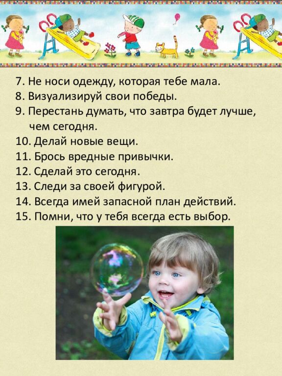 7. Не носи одежду, которая тебе мала. 8. Визуализируй свои победы. 9. Перестань думать, что завтра будет лучше, чем сегодня. 10. Делай новые вещи. 11. Брось вредные привычки. 12. Сделай это сегодня. 13. Следи за своей фигурой. 14. Всегда имей запасной план действий. 15. Помни, что у тебя всегда есть выбор.