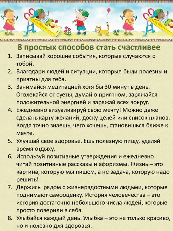 8 простых способов стать счастливее Записывай хорошие события, которые случаются с тобой. Благодари людей и ситуации, которые были полезны и приятны для тебя. Занимайся медитацией хотя бы 30 минут в день. Отвлекайся от суеты, думай о приятном, заряжайся положительной энергией и заряжай всех вокруг. Ежедневно визуализируй свою мечту! Можно даже сделать карту желаний, доску целей или список планов. Когда точно знаешь, чего хочешь, становишься ближе к мечте. Улучшай свое здоровье. Ешь полезную пищу, уделяй время отдыху. Используй позитивные утверждения и ежедневно читай позитивные рассказы и афоризмы. Жизнь – это картина, которую мы пишем, а не задача, которую надо решить! Держись рядом с жизнерадостными людьми, которые поднимают самооценку. История человечества – это история достаточно небольшого числа людей, которые просто поверили в себя. Улыбайся каждый день. Улыбка – это не только красиво, но и полезно для здоровья.