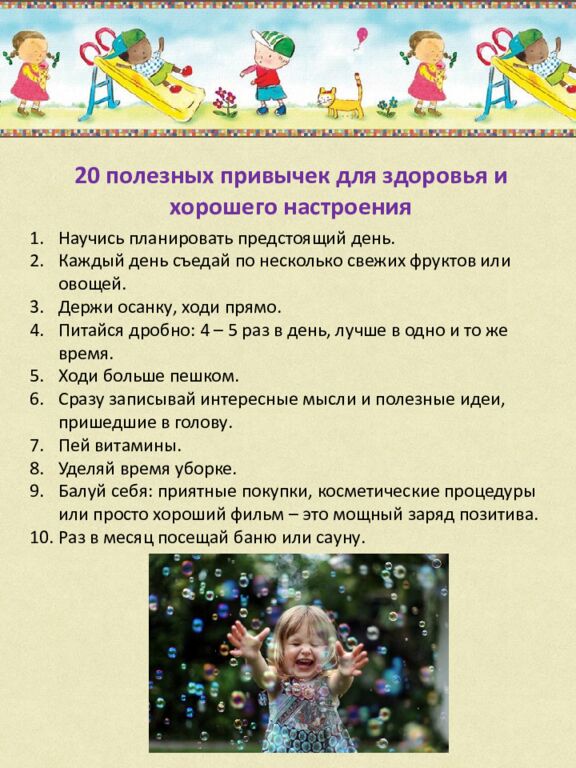 20 полезных привычек для здоровья и хорошего настроения Научись планировать предстоящий день. Каждый день съедай по несколько свежих фруктов или овощей. Держи осанку, ходи прямо. Питайся дробно: 4 – 5 раз в день, лучше в одно и то же время. Ходи больше пешком. Сразу записывай интересные мысли и полезные идеи, пришедшие в голову. Пей витамины. Уделяй время уборке. Балуй себя: приятные покупки, косметические процедуры или просто хороший фильм – это мощный заряд позитива. Раз в месяц посещай баню или сауну.