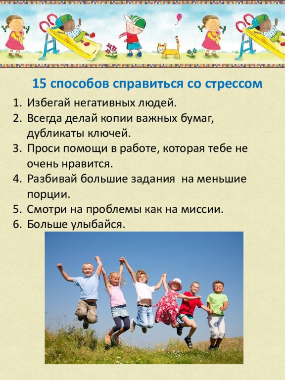 15 способов справиться со стрессом Избегай негативных людей. Всегда делай копии важных бумаг, дубликаты ключей. Проси помощи в работе, которая тебе не очень нравится. Разбивай большие задания на меньшие порции. Смотри на проблемы как на миссии. Больше улыбайся.
