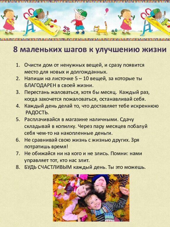 8 маленьких шагов к улучшению жизни Очисти дом от ненужных вещей, и сразу появится место для новых и долгожданных. Напиши на листочке 5 – 10 вещей, за которые ты БЛАГОДАРЕН в своей жизни. Перестань жаловаться, хотя бы месяц. Каждый раз, когда захочется пожаловаться, останавливай себя. Каждый день делай то, что доставляет тебе искреннюю РАДОСТЬ. Расплачивайся в магазине наличными. Сдачу складывай в копилку. Через пару месяцев побалуй себя чем-то на накопленные деньги. Не сравнивай свою жизнь с жизнью других. Зря потратишь время! Не обижайся ни на кого и не злись. Помни: нами управляет тот, кто нас злит. БУДЬ СЧАСТЛИВЫМ каждый день. Ты это можешь.
