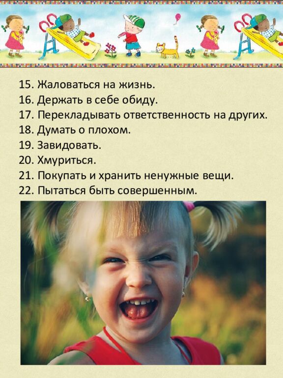 15. Жаловаться на жизнь. 16. Держать в себе обиду. 17. Перекладывать ответственность на других. 18. Думать о плохом. 19. Завидовать. 20. Хмуриться. 21. Покупать и хранить ненужные вещи. 22. Пытаться быть совершенным.