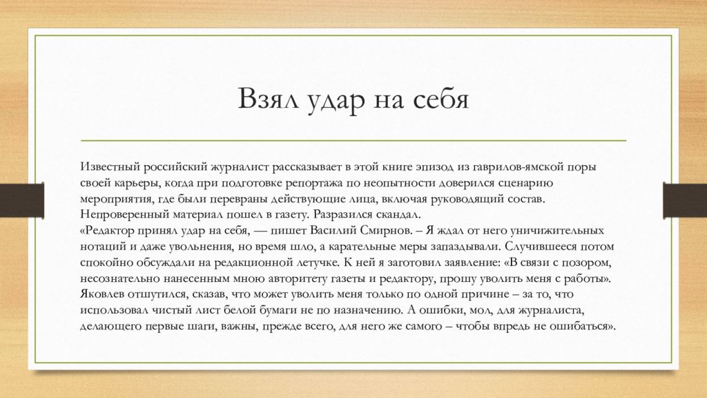 Известный российский журналист рассказывает в этой книге эпизод из гаврилов-ямской поры своей карьеры, когда при подготовке репортажа по неопытности доверился сценарию мероприятия, где были перевраны действующие лица, включая руководящий состав. Непроверенный материал пошел в газету. Разразился скандал. «Редактор принял удар на себя, — пишет Василий Смирнов. – Я ждал от него уничижительных нотаций и даже увольнения, но время шло, а карательные меры запаздывали. Случившееся потом спокойно обсуждали на редакционной летучке. К ней я заготовил заявление: «В связи с позором, несознательно нанесенным мною авторитету газеты и редактору, прошу уволить меня с работы». Яковлев отшутился, сказав, что может уволить меня только по одной причине – за то, что использовал чистый лист белой бумаги не по назначению. А ошибки, мол, для журналиста, делающего первые шаги, важны, прежде всего, для него же самого – чтобы впредь не ошибаться».
