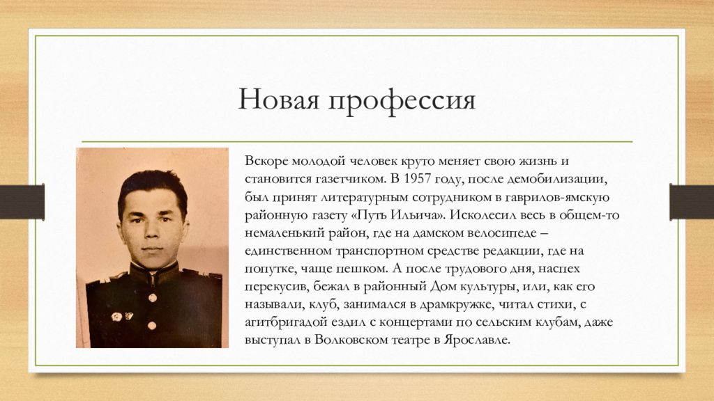 Вскоре молодой человек круто меняет свою жизнь и становится газетчиком. В 1957 году, после демобилизации, был принят литературным сотрудником в гаврилов-ямскую районную газету «Путь Ильича». Исколесил весь в общем-то немаленький район, где на дамском велосипеде – единственном транспортном средстве редакции, где на попутке, чаще пешком. А после трудового дня, наспех перекусив, бежал в районный Дом культуры, или, как его называли, клуб, занимался в драмкружке, читал стихи, с агитбригадой ездил с концертами по сельским клубам, даже выступал в Волковском театре в Ярославле.