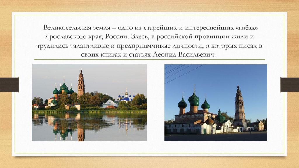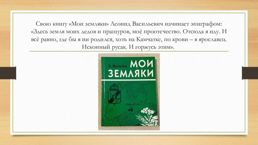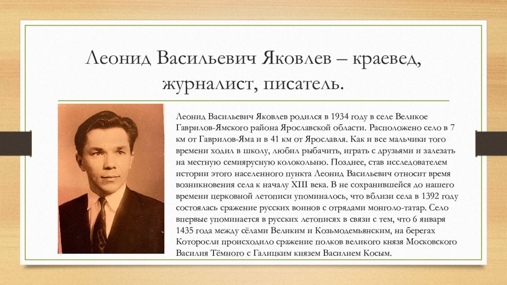 Леонид Васильевич Яковлев родился в 1934 году в селе Великое Гаврилов-Ямского района Ярославской области. Расположено село в 7 км от Гаврилов-Яма и в 41 км от Ярославля. Как и все мальчики того времени ходил в школу, любил рыбачить, играть с друзьями и залезать на местную семиярусную колокольню. Позднее, став исследователем истории этого населенного пункта Леонид Васильевич относит время возникновения села к началу XIII века. В не сохранившейся до нашего времени церковной летописи упоминалось, что вблизи села в 1392 году состоялась сражение русских воинов с отрядами монголо-татар. Село впервые упоминается в русских летописях в связи с тем, что 6 января 1435 года между сёлами Великим и Козьмодемьянским, на берегах Которосли происходило сражение полков великого князя Московского Василия Тёмного с Галицким князем Василием Косым.