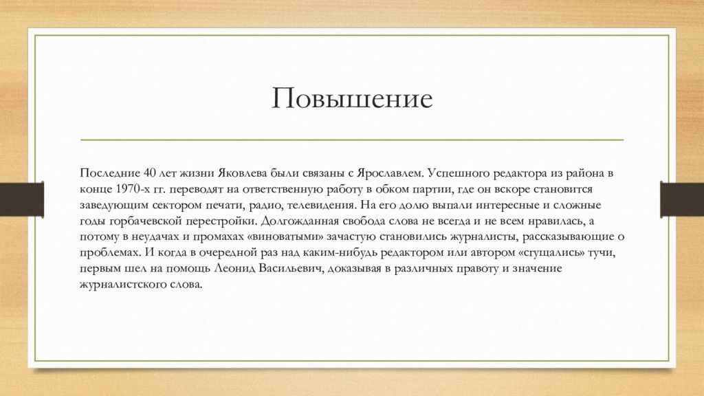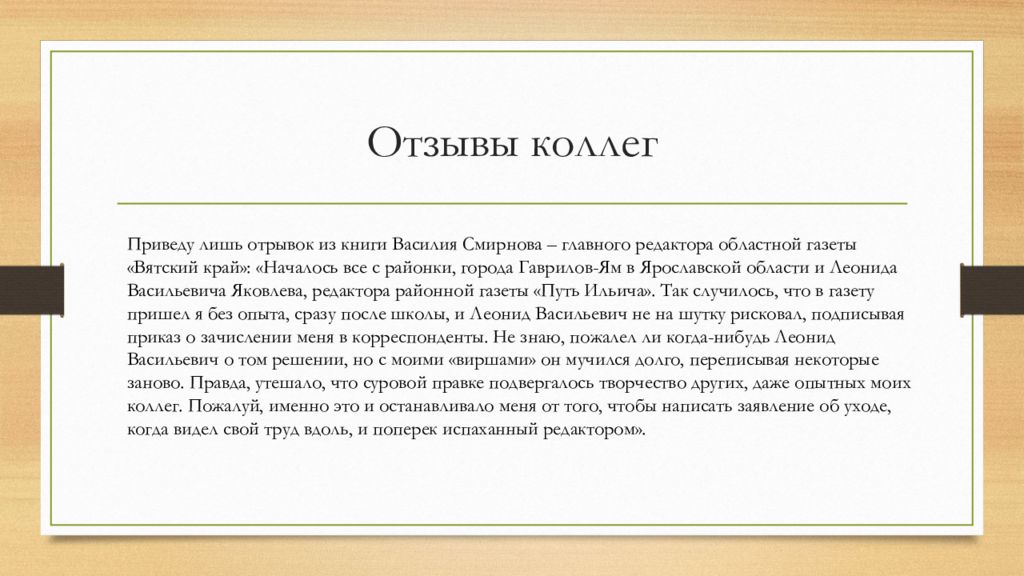 Приведу лишь отрывок из книги Василия Смирнова – главного редактора областной газеты «Вятский край»: «Началось все с районки, города Гаврилов-Ям в Ярославской области и Леонида Васильевича Яковлева, редактора районной газеты «Путь Ильича». Так случилось, что в газету пришел я без опыта, сразу после школы, и Леонид Васильевич не на шутку рисковал, подписывая приказ о зачислении меня в корреспонденты. Не знаю, пожалел ли когда-нибудь Леонид Васильевич о том решении, но с моими «виршами» он мучился долго, переписывая некоторые заново. Правда, утешало, что суровой правке подвергалось творчество других, даже опытных моих коллег. Пожалуй, именно это и останавливало меня от того, чтобы написать заявление об уходе, когда видел свой труд вдоль, и поперек испаханный редактором».