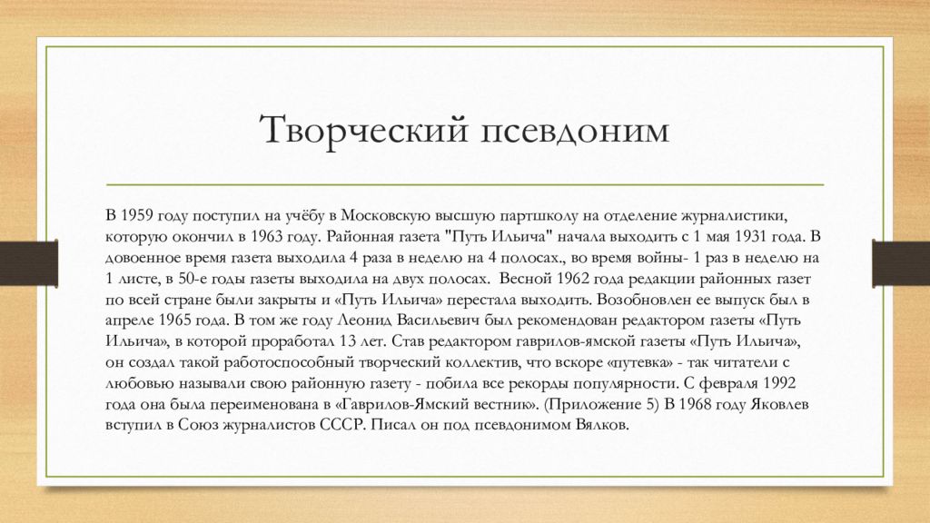 В 1959 году поступил на учёбу в Московскую высшую партшколу на отделение журналистики, которую окончил в 1963 году. Районная газета "Путь Ильича" начала выходить с 1 мая 1931 года. В довоенное время газета выходила 4 раза в неделю на 4 полосах., во время войны- 1 раз в неделю на 1 листе, в 50-е годы газеты выходила на двух полосах. Весной 1962 года редакции районных газет по всей стране были закрыты и «Путь Ильича» перестала выходить. Возобновлен ее выпуск был в апреле 1965 года. В том же году Леонид Васильевич был рекомендован редактором газеты «Путь Ильича», в которой проработал 13 лет. Став редактором гаврилов-ямской газеты «Путь Ильича», он создал такой работоспособный творческий коллектив, что вскоре «путевка» - так читатели с любовью называли свою районную газету - побила все рекорды популярности. С февраля 1992 года она была переименована в «Гаврилов-Ямский вестник». (Приложение 5) В 1968 году Яковлев вступил в Союз журналистов СССР. Писал он под псевдонимом Вялков.