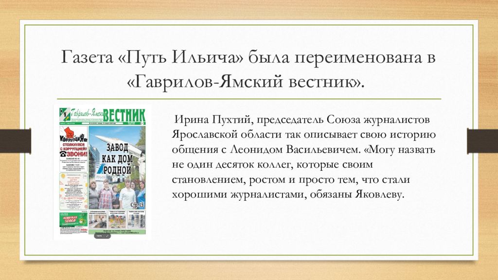 Слайд 8: Газета «Путь Ильича» была переименована в «Гаврилов-Ямский вестник»