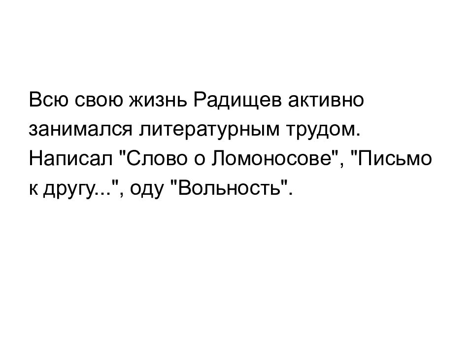 Всю свою жизнь Радищев активно занимался литературным трудом. Написал "Слово о Ломоносове", "Письмо к другу...", оду "Вольность".