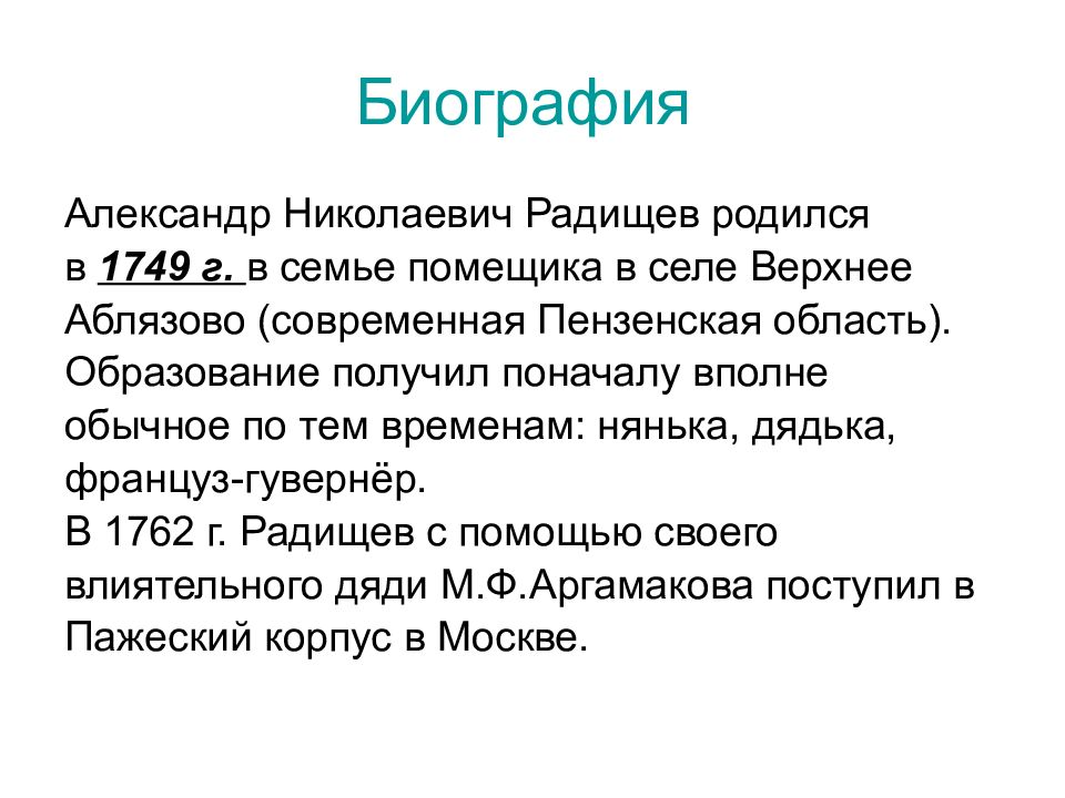 Александр Николаевич Радищев родился в 1749 г. в семье помещика в селе Верхнее Аблязово (современная Пензенская область). Образование получил поначалу вполне обычное по тем временам: нянька, дядька, француз-гувернёр. В 1762 г. Радищев с помощью своего влиятельного дяди М.Ф.Аргамакова поступил в Пажеский корпус в Москве.