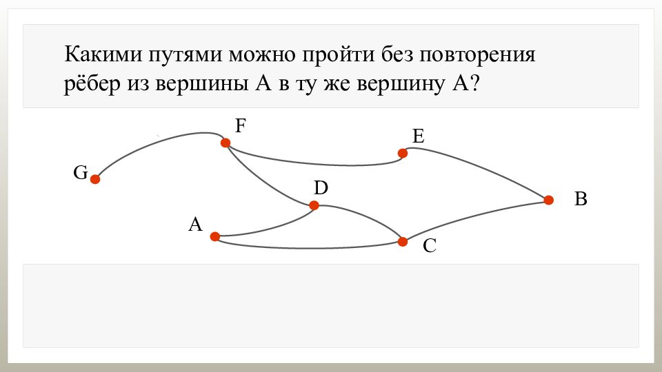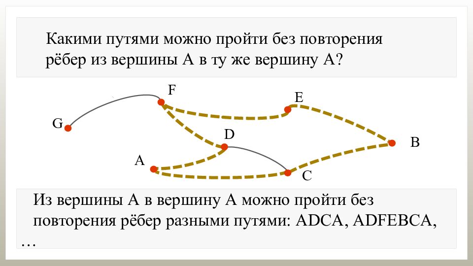 Какими путями можно пройти без повторения рёбер из вершины А в ту же вершину А? Из вершины А в вершину А можно пройти без повторения рёбер разными путями: ADCA, ADFEBCA,…