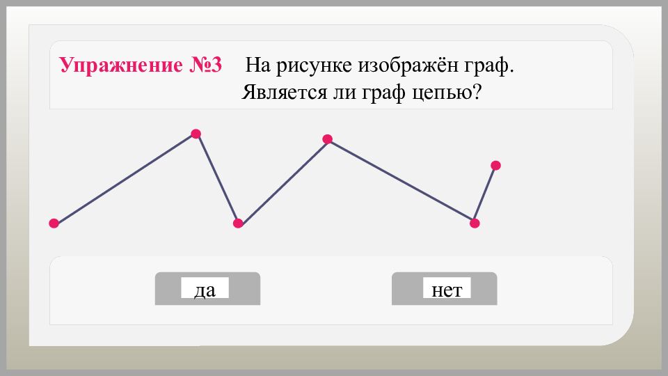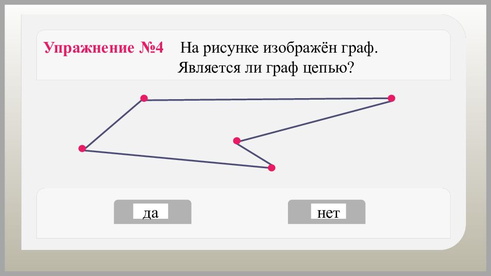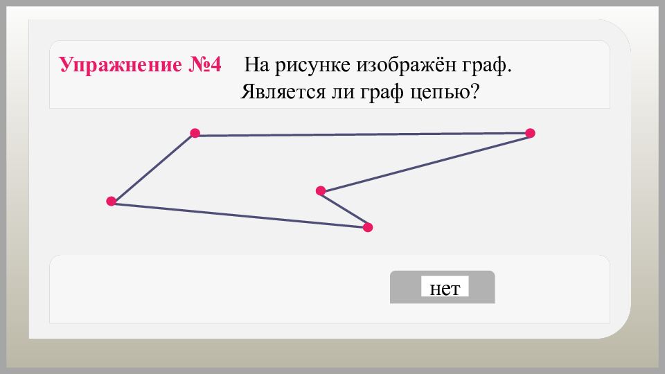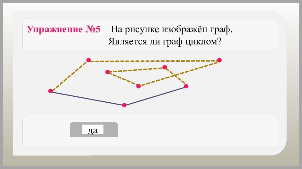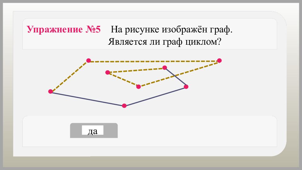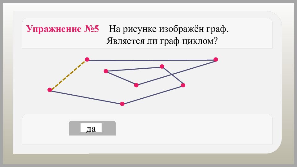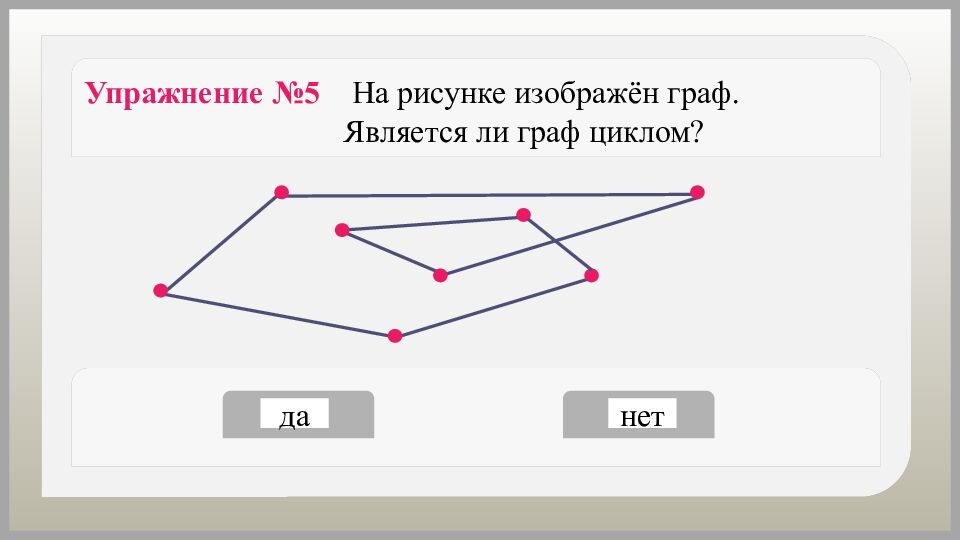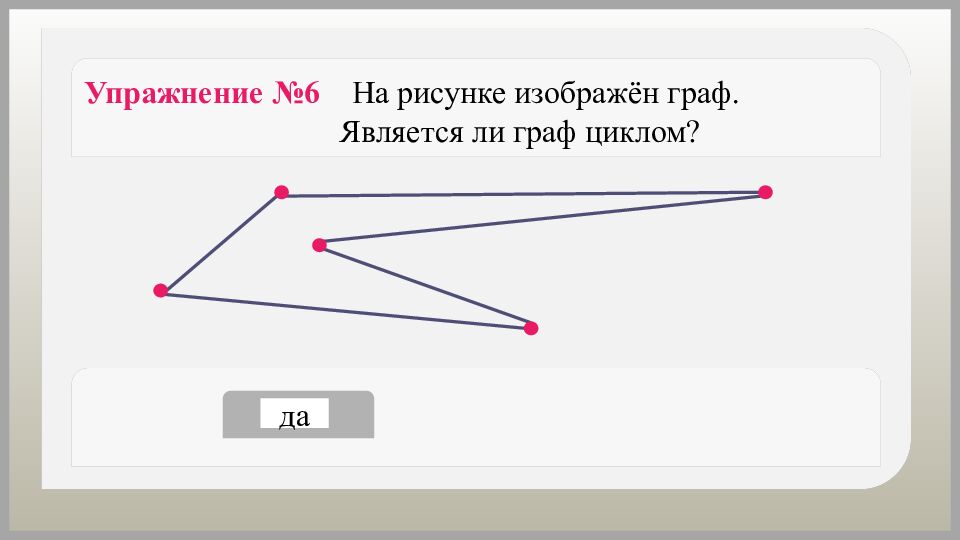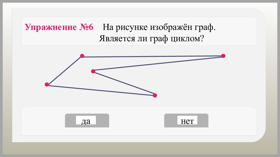 Упражнение №6 На рисунке изображён граф. Является ли граф циклом? да нет