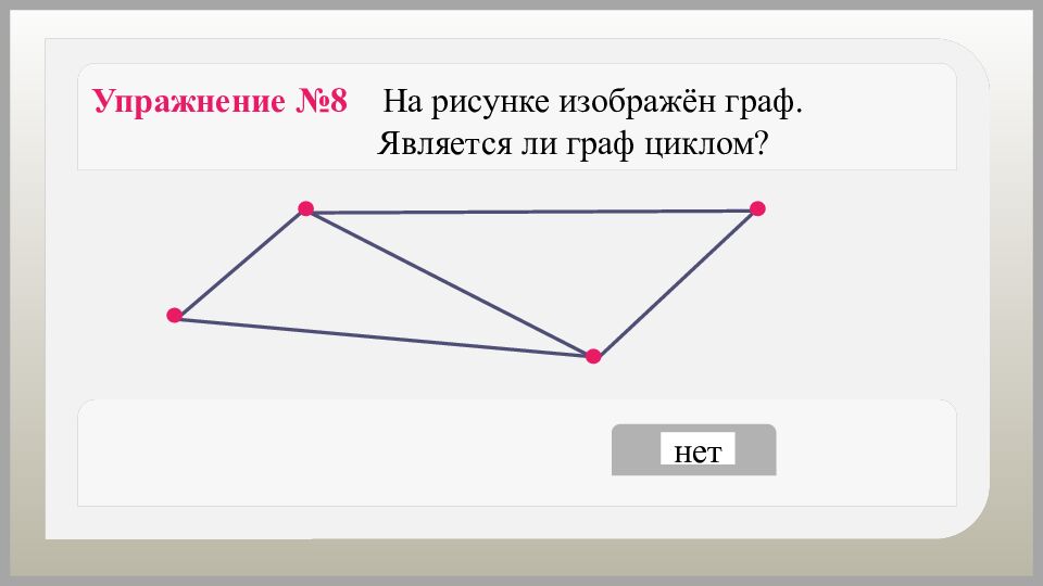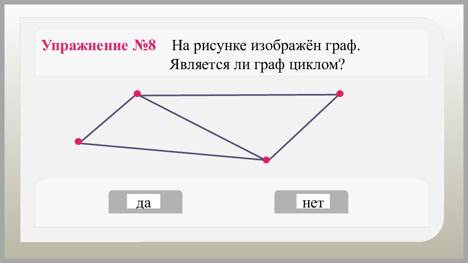 да нет Упражнение №8 На рисунке изображён граф. Является ли граф циклом?