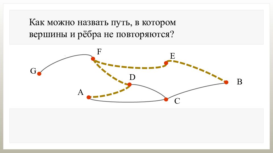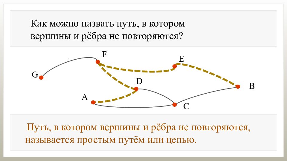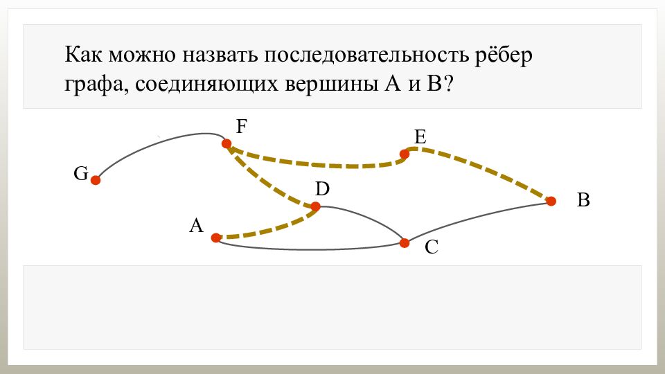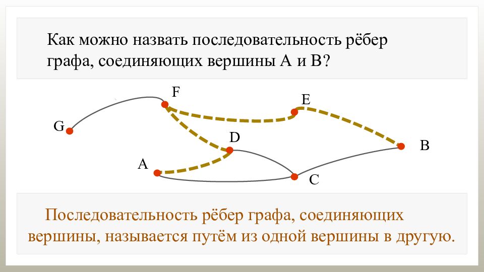 Как можно назвать последовательность рёбер графа, соединяющих вершины А и В? Последовательность рёбер графа, соединяющих вершины, называется путём из одной вершины в другую.
