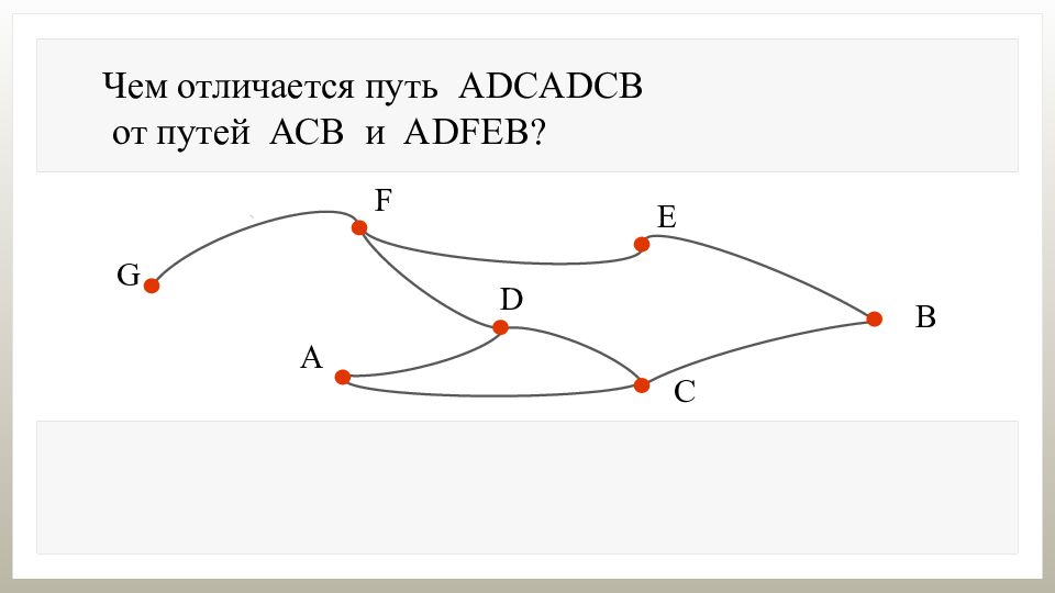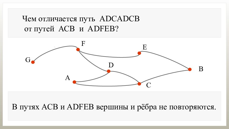 Чем отличается путь ADCADCB от путей АСВ и А DFEB ? В путях АСВ и А DFEB вершины и рёбра не повторяются.
