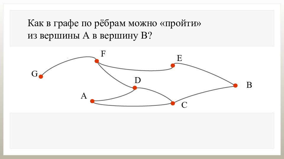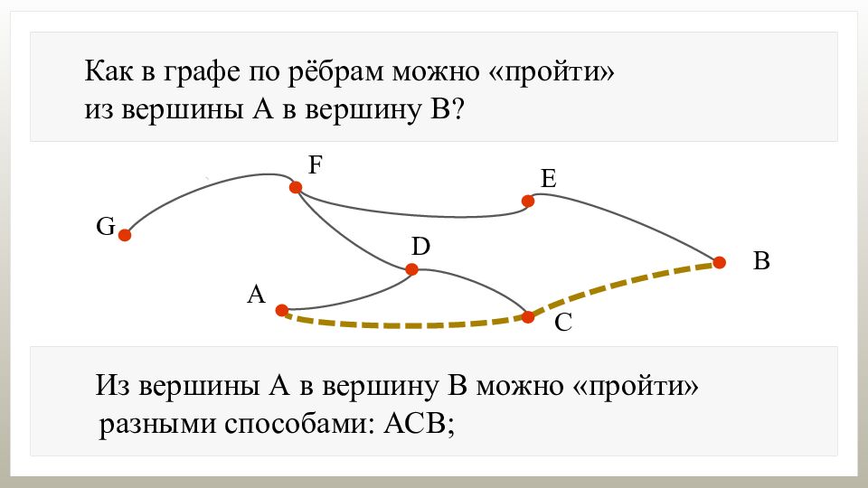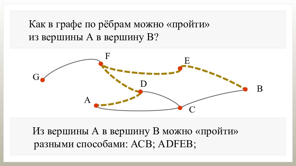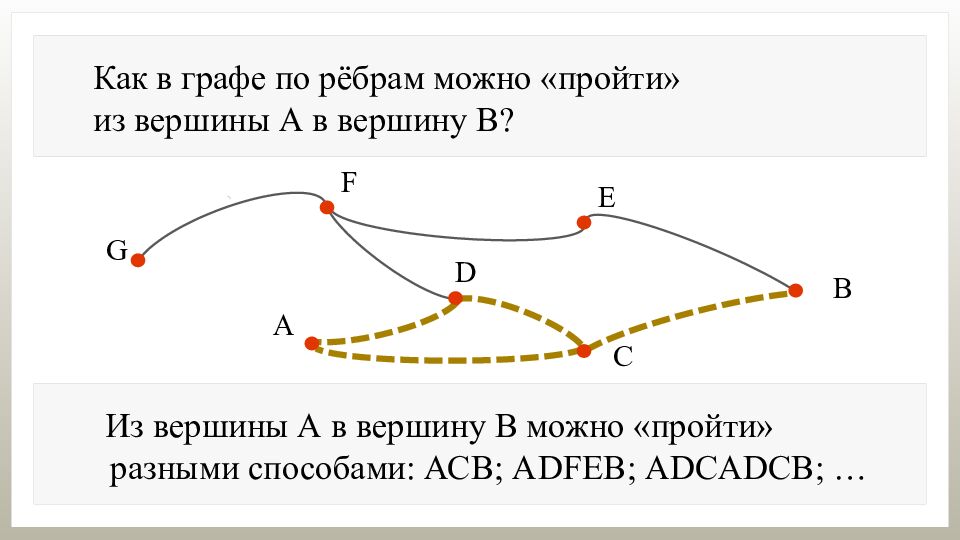 Как в графе по рёбрам можно «пройти» из вершины А в вершину В? Из вершины А в вершину В можно «пройти» разными способами: АСВ; А DFEB ; ADCADCB ; …