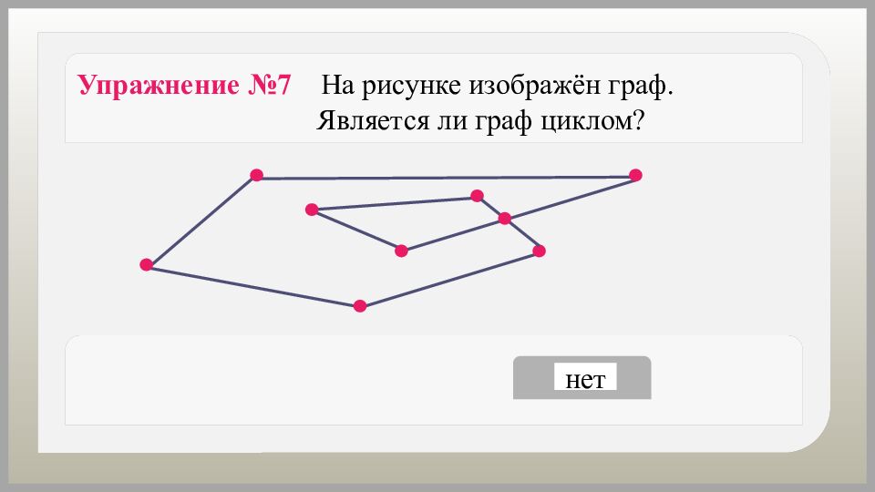 да нет Упражнение №7 На рисунке изображён граф. Является ли граф циклом?